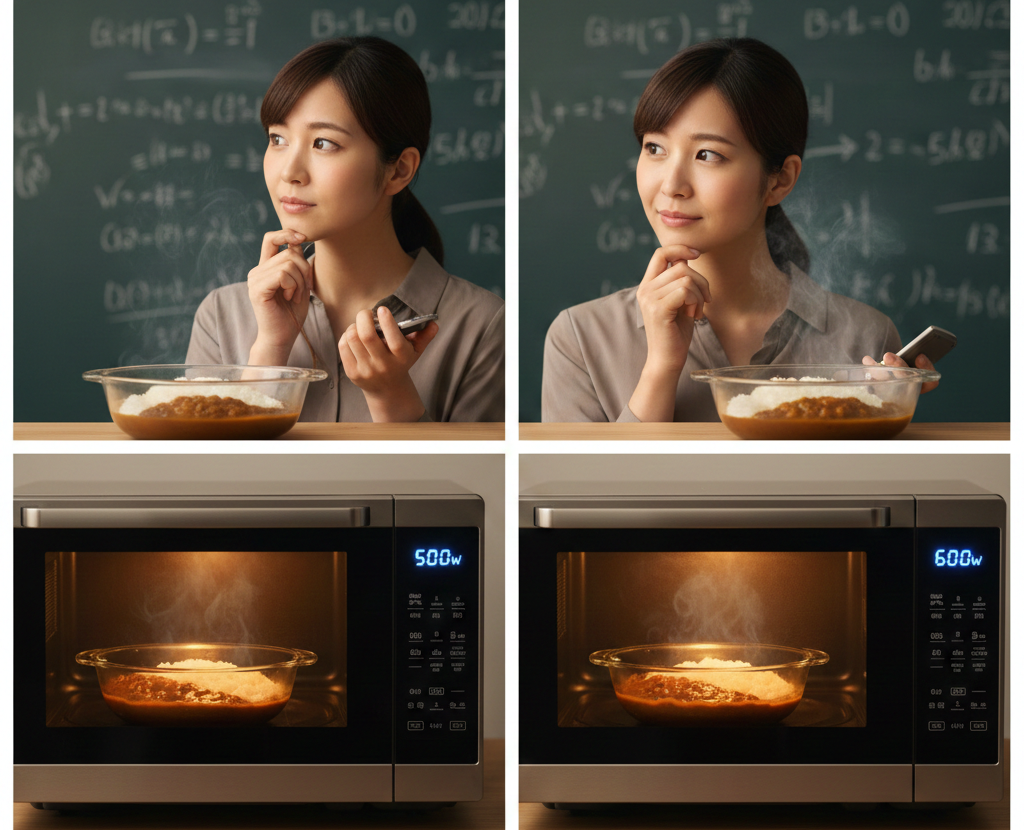 対処法としてはシンプルに、すべてのレシピを「1.2倍の時間」で捉えればいいだけです。例えば「600Wで1分」なら「1分12秒」。多くのコンビニ弁当にも、業務用1500Wの隣には必ず500Wの目安が書かれています。つまり、世の中のほとんどの加工食品は500Wでの調理を想定してテストされているということ。500Wしかないことを「時間がかかる」とデメリットに捉えるのではなく、「どんな料理も失敗しにくい出力設定がデフォルトになっている」とポジティブに捉えてみてください。時間を少しだけ余分に待つだけで、料理はより均一に、美味しく仕上がりますよ。