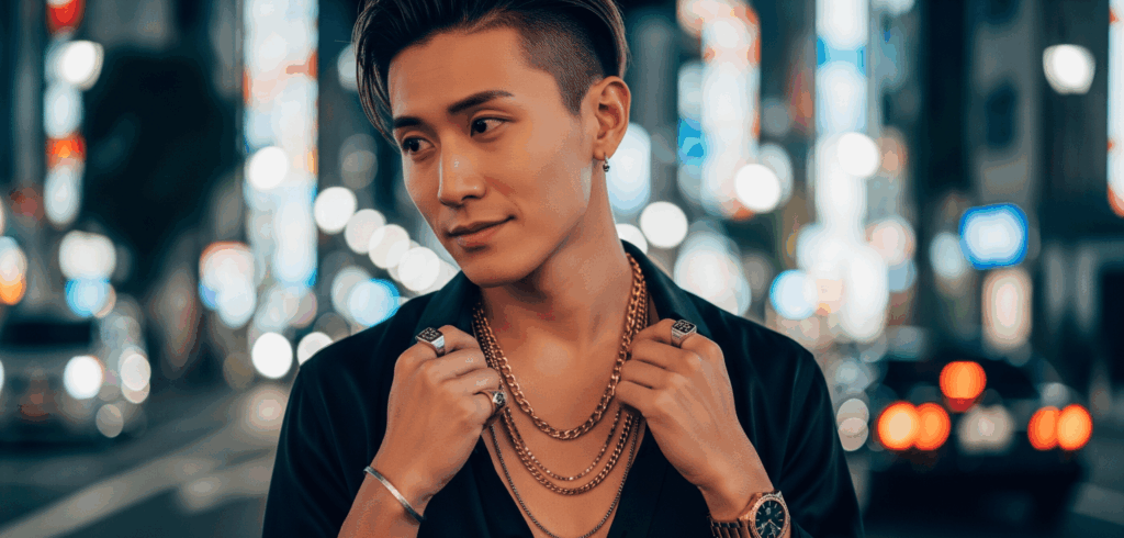 一方で、近年ではゴールドアクセサリーを愛用する男性も増えています。ゴールドが持つ上品さとラグジュアリーな雰囲気は、コーディネートを格上げし、大人の色気を引き出してくれます。シンプルなチェーンネックレスやリングを一つ着けるだけで、ぐっと華やかさが増し、他の人と差をつけることが可能です。特に、きれいめなジャケットスタイルやシンプルなニットに合わせると、ゴールドの輝きが際立ちます。